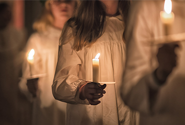 Am Morgen des 13. Dezember bringt meist die älteste Tochter als Heilige Lucia der Familie das Frühstück ans Bett. Sie trägt dabei ein weißes Kleid mit roter Schärpe und einen Lichterkranz auf dem Kopf. Heutzutage ist dieser meist mit elektrischen statt mit echten Kerzen bestückt. Am Abend gibt es eine große Prozession, angeführt von einer heiligen Lucia und weiteren Mädchen („tärnor“), die Kerzen in der Hand halten. Manchmal nehmen auch Sternknaben („stjärngossar“) an der Prozession teil. Traditionell wird an diesem Tag das mit Safran gewürzte Hefegebäck „lussekatter“gereicht.1